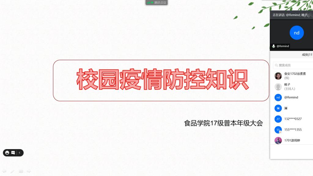 秋风送爽,物阜年丰。伴着初秋的收获,武汉轻工大学全体师生也终于返校。为了加强肺炎疫情防控期间学生安全和疫情防控工作,保障师生身体健康和生命安全,维护学校正常教学秩序,武汉轻工大学食品学院17级普本全体同学在辅导员阮秀娟老师的带领下于2020年9月8日16:00于线上开展年级大会暨疫情防控座谈会。
