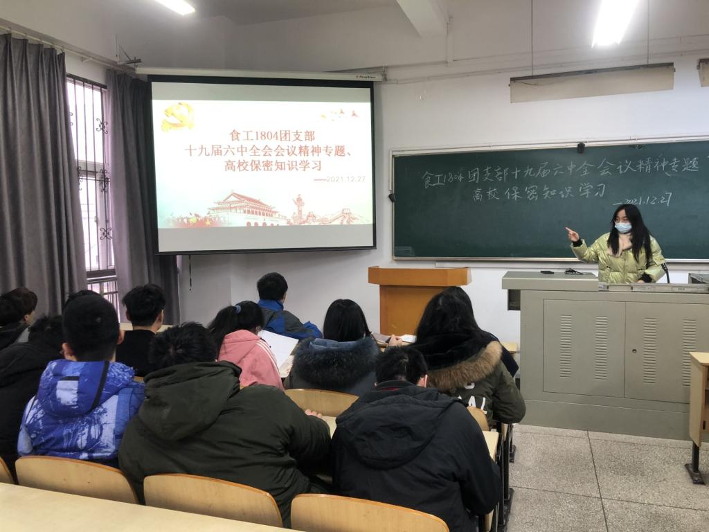 为使同学们及时领会党的十九届六中全会精神,深入学习党的方针政策,进一步激发同学们的爱党爱国热情;同时加大保密知识普及力度,提高全体师生对保密工作重要性的认识,2021年12月27-28日,食品学院18级各团支部组织召开了“学习党的十九届六中全会精神、学习高校师生保密知识”主题团会。